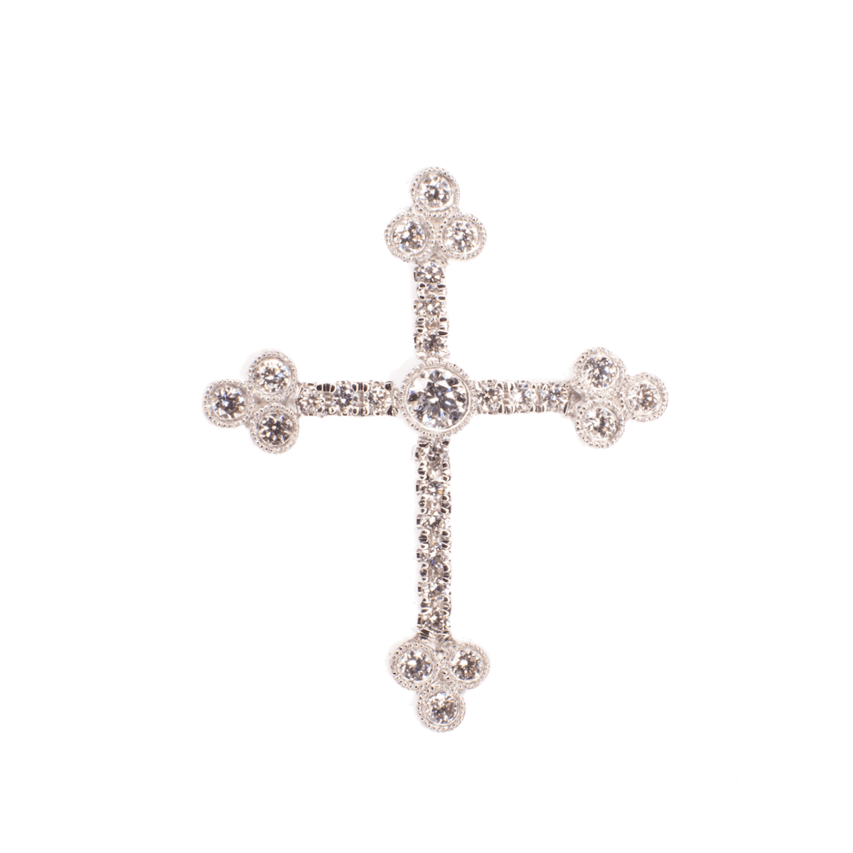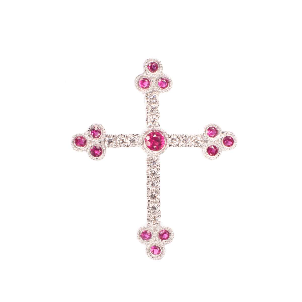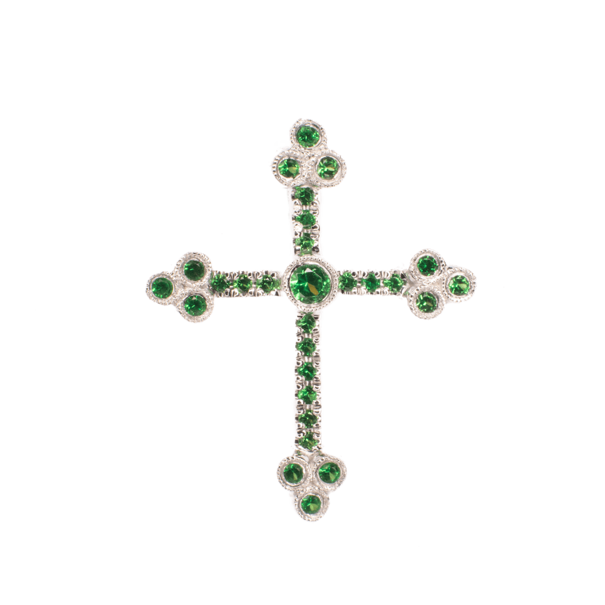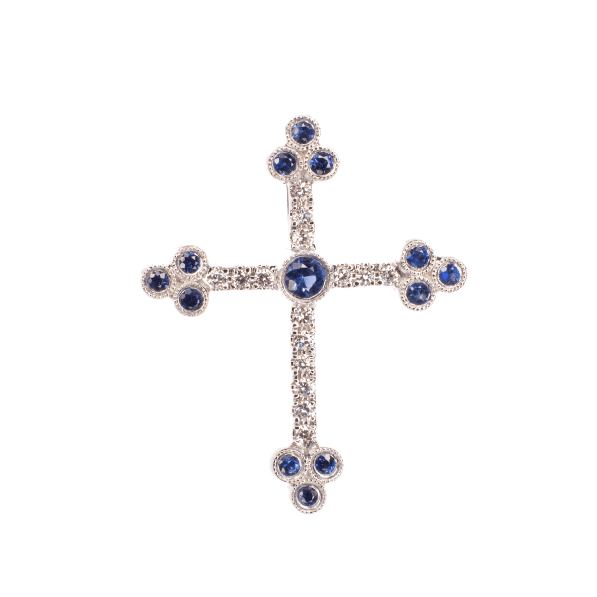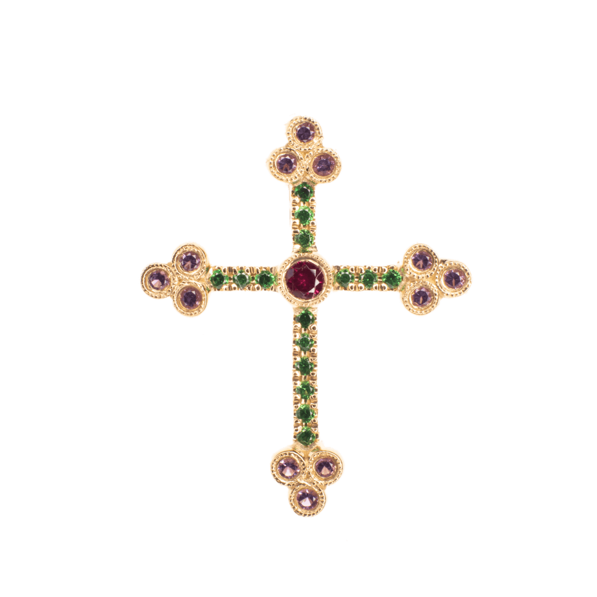 The Inner Cross is suspended within the Outer Cross, AND every single gemstone and diamond is cut with the full 57 facets, creating a sparkle so miraculous you just have to see it to believe it.