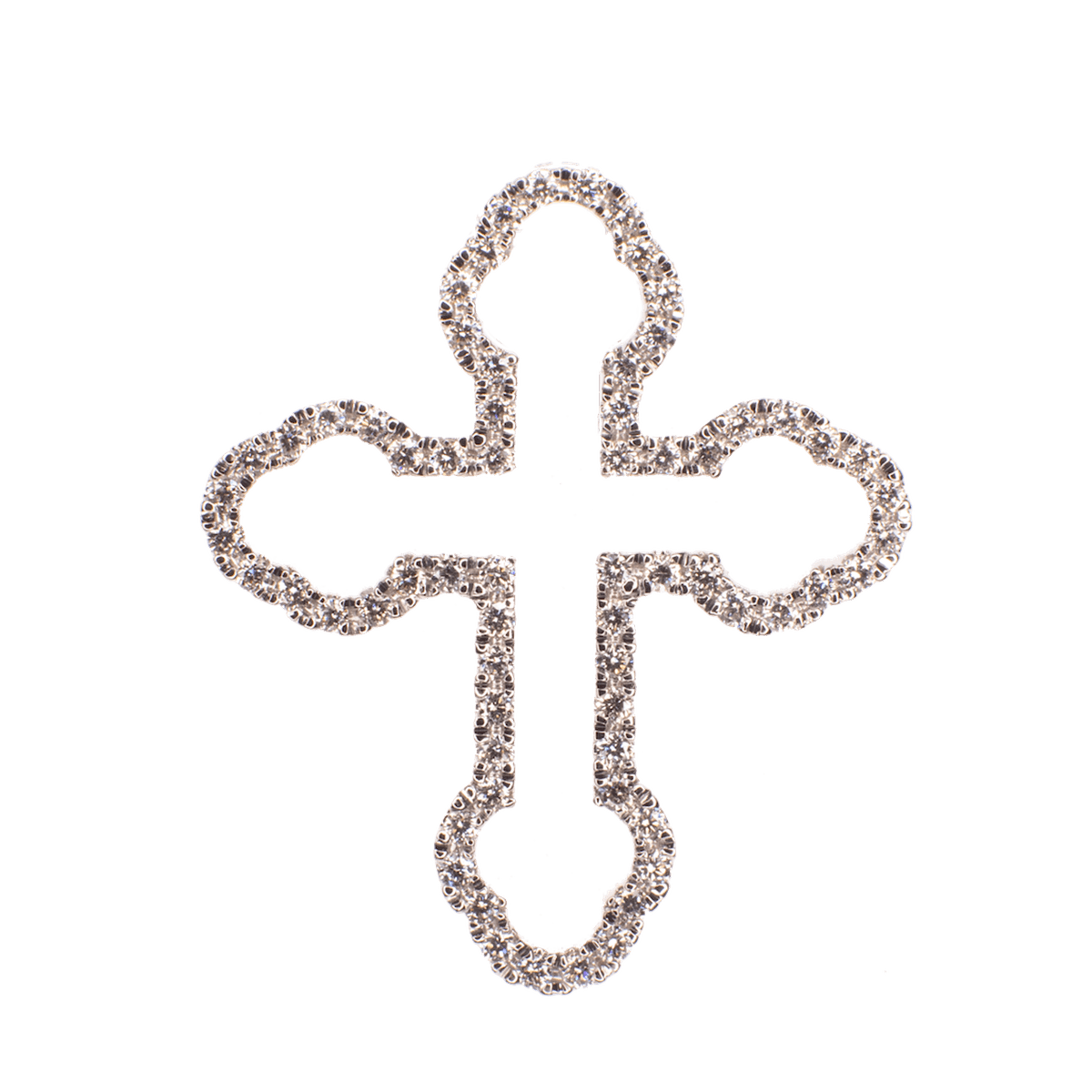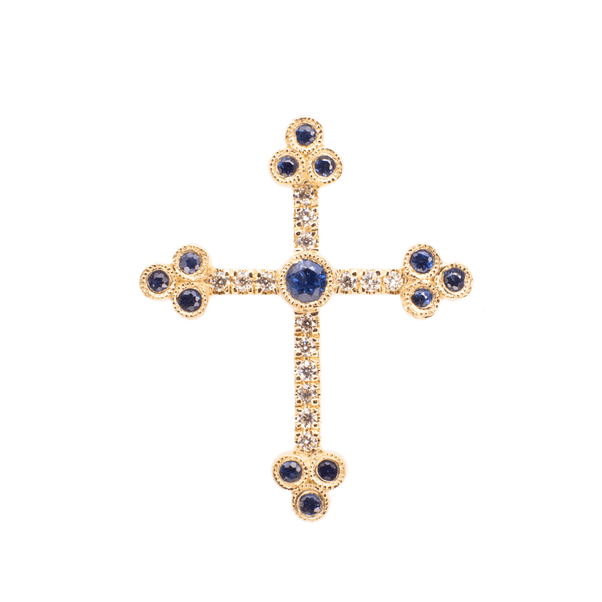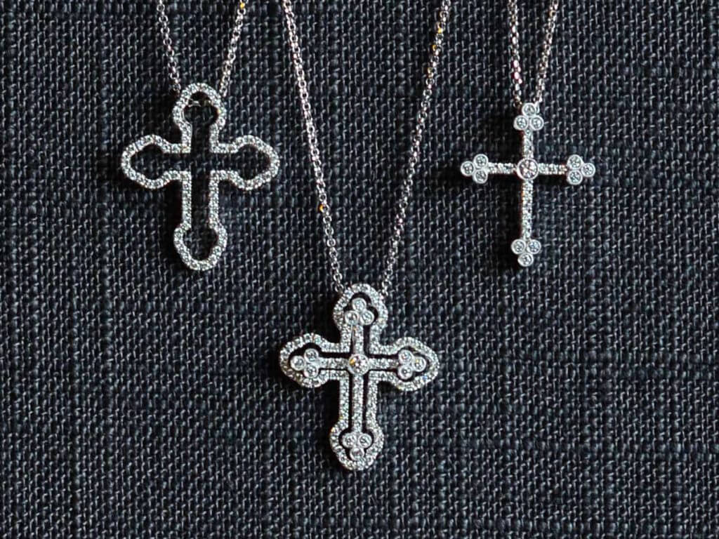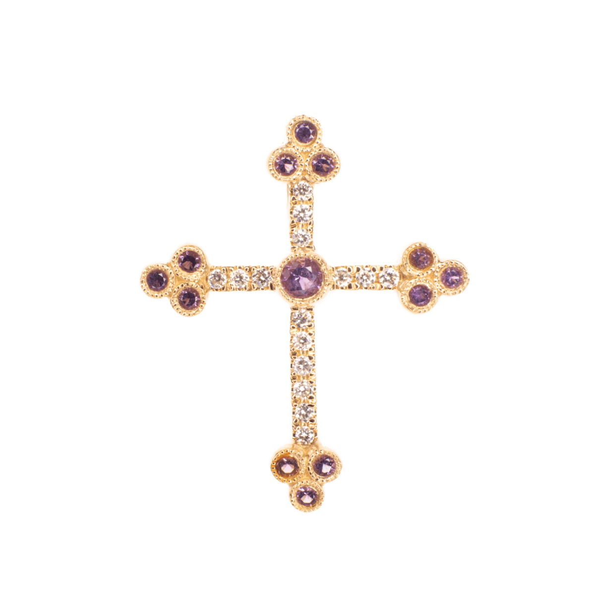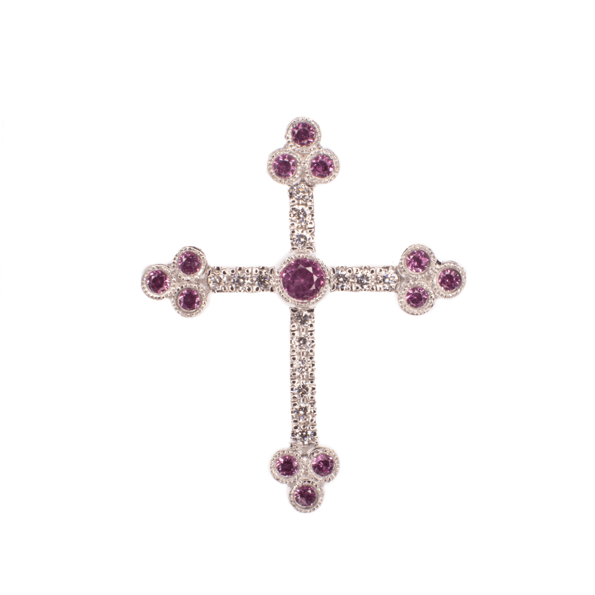 The Inner Cross is suspended within the Outer Cross, AND every single gemstone and diamond is cut with the full 57 facets, creating a sparkle so miraculous you just have to see it to believe it.